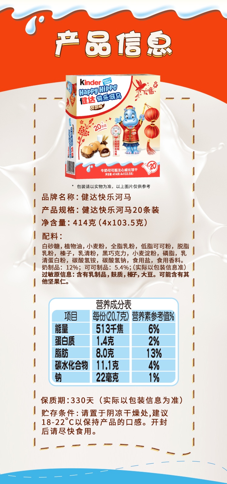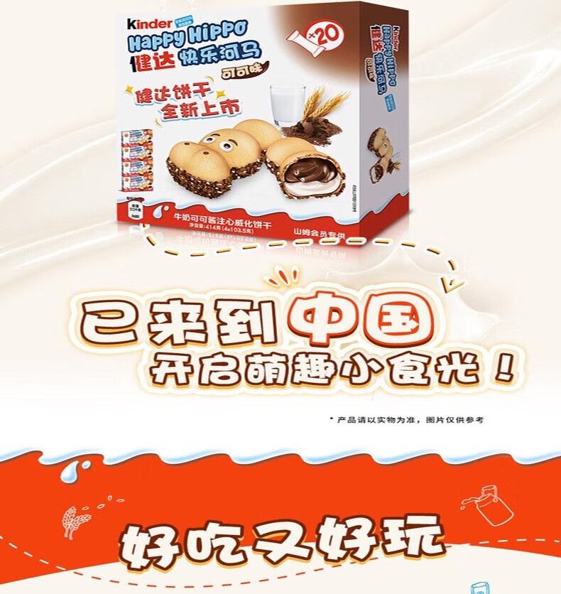 健達(Kinder) 德國進口巧克力快樂河馬牛奶可可醬註心威化餅幹414g山姆S正品專業代購