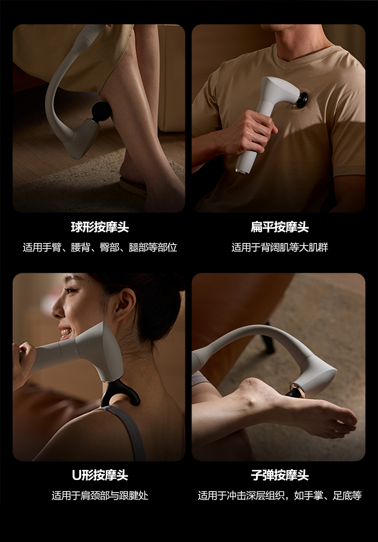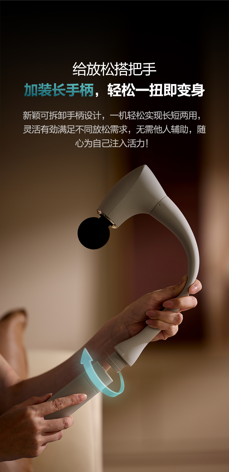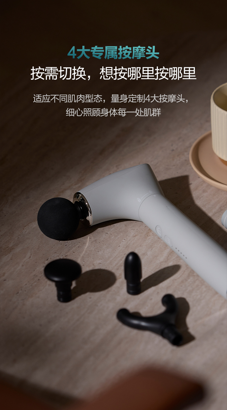 可拆手柄设计,一机两用 配备4种按摩头 5阶压力反馈,力度清晰可控2500毫安电池,持久续航