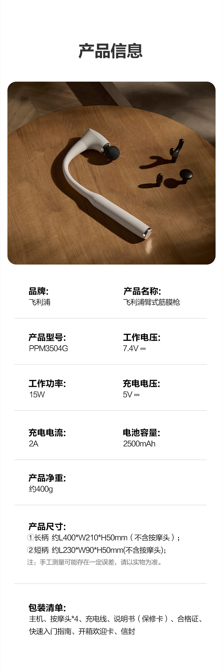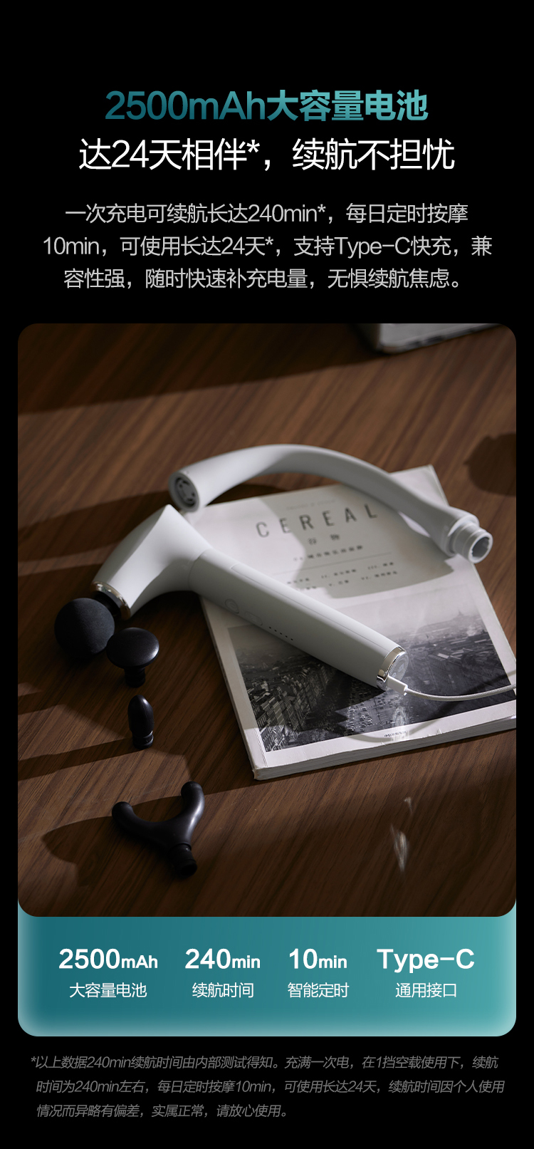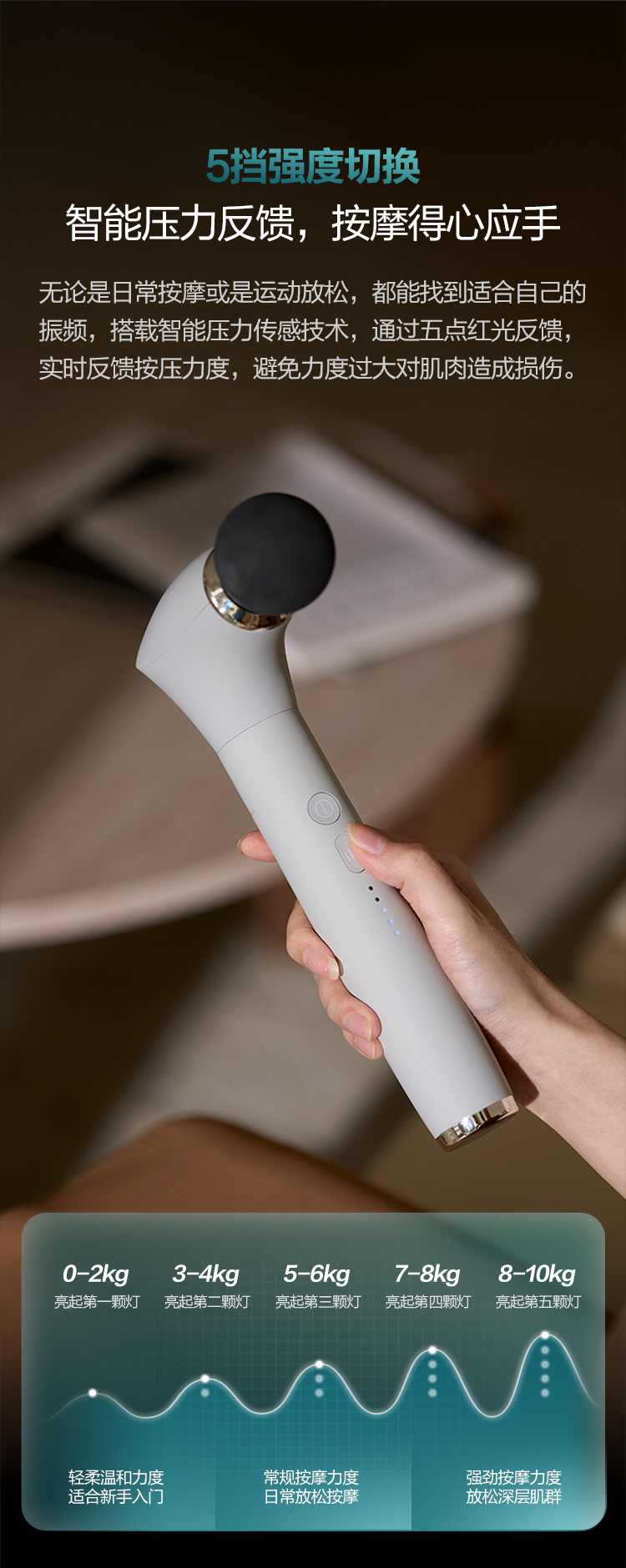 可拆手柄设计,一机两用 配备4种按摩头 5阶压力反馈,力度清晰可控2500毫安电池,持久续航
