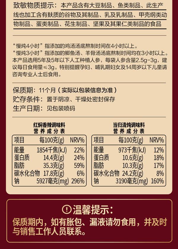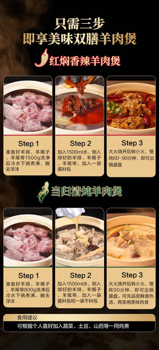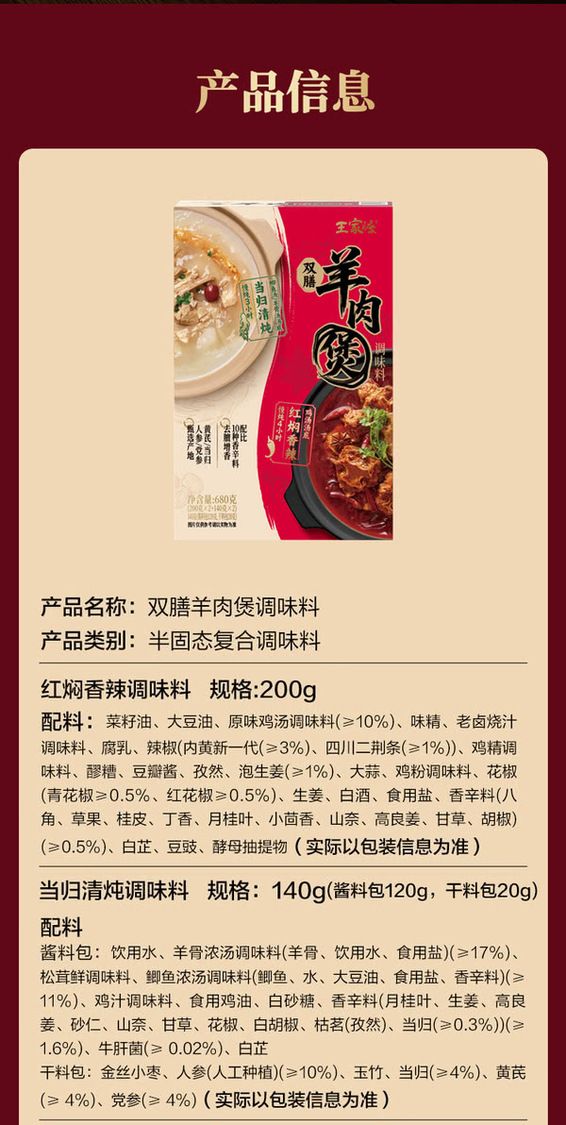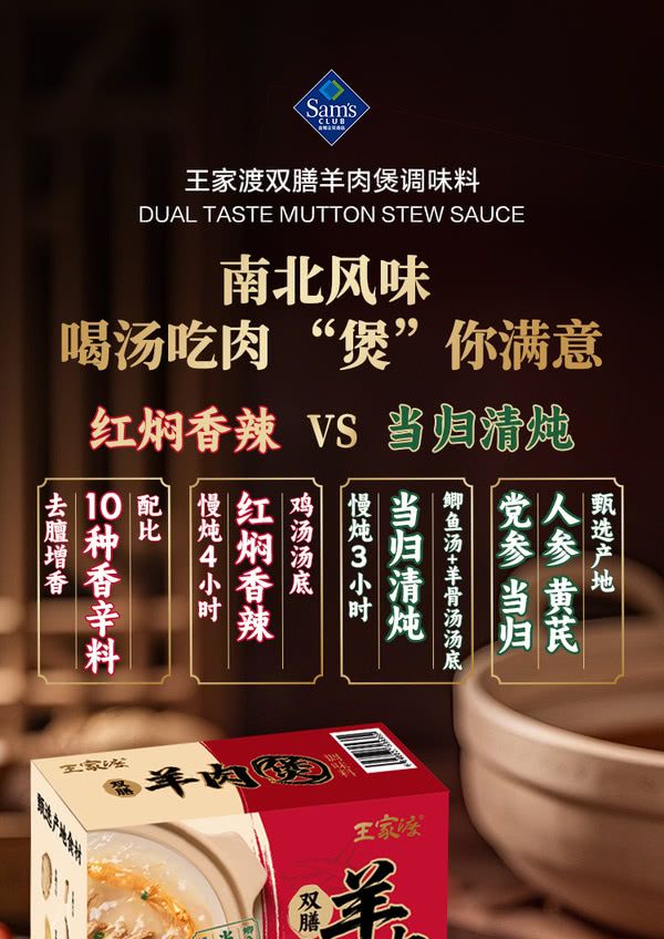 王家渡 雙膳羊肉煲調味料680克(紅燜香辣調味料200g*2+當歸清燉調味料140g*2)山姆Sam's Club正品專業代購 山姆正品專業代購