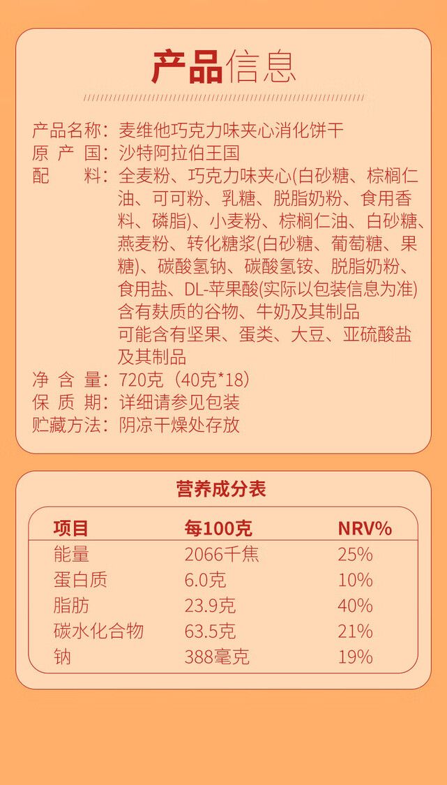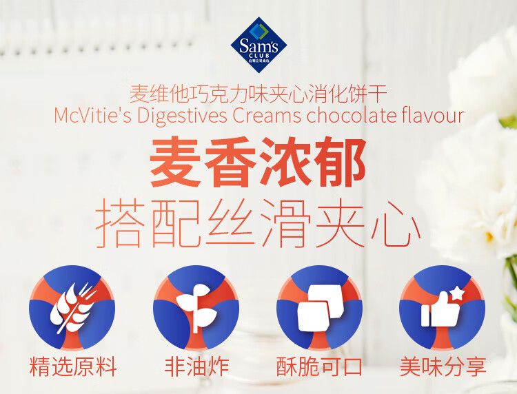 麦维他进口 巧克力味夹心消化饼干 720克(40克*18) 山姆Sam’s Club正品專業代購
