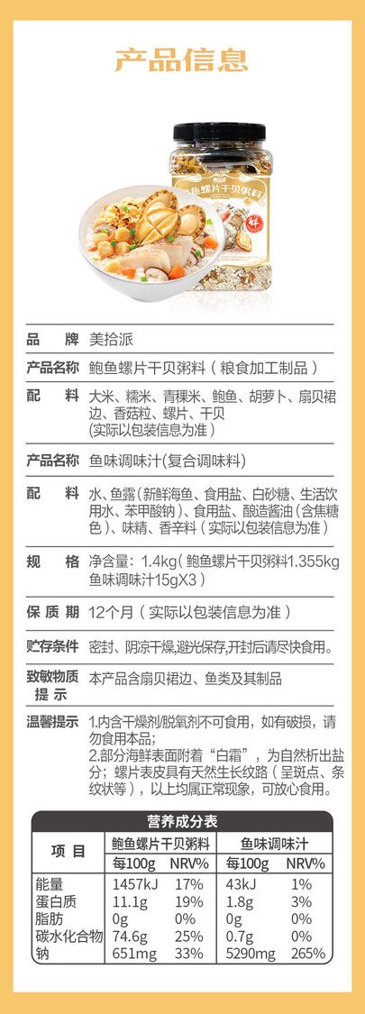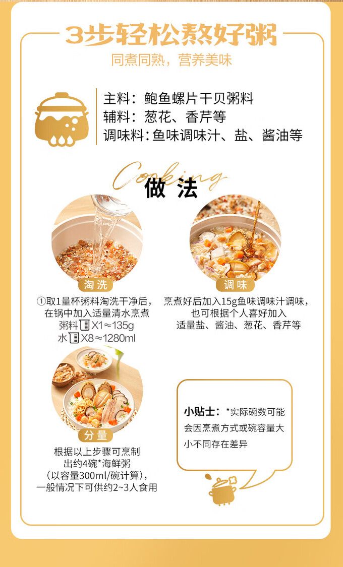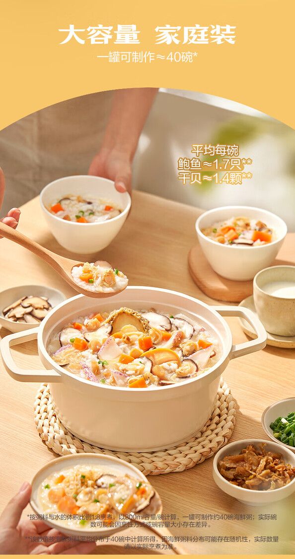 每罐鲍鱼>70只,干贝>56粒 9种食材搭配,省心易煮,鲜香绵滑每罐螺片>28g,口感Q弹