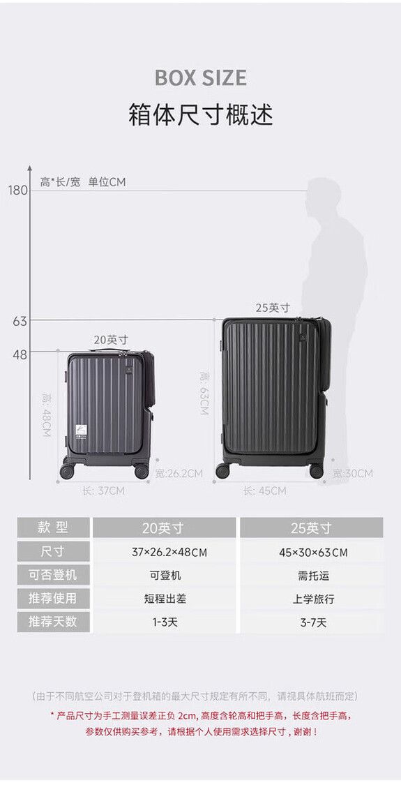 前侧开盖模式,多独立空间方便收纳 双排顺滑万向轮 TSA海关双向密码锁,安全性强。