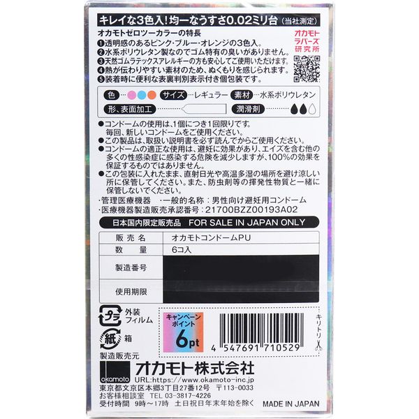 岡本 - 薄度均一 (3種 顏色) 保險安全套 6 枚 [平行進口]