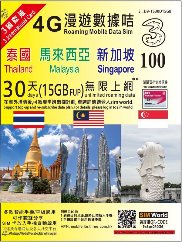 3HK 泰國/新加坡/馬來西亞30天15GB無限上網卡 4G漫游數據卡/電話卡(首15GB高速數據)