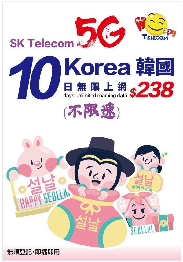 HAPPY TELECOM 開心電訊 - 韓國 SK Telecom 10日5G無限數據 (不限速)