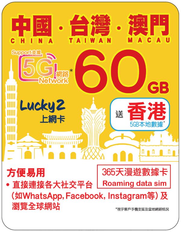 Lucky2 60GB 【中國 台灣 澳門 】中台澳 365日 LTE 純數據 漫遊年卡 送香港5GB