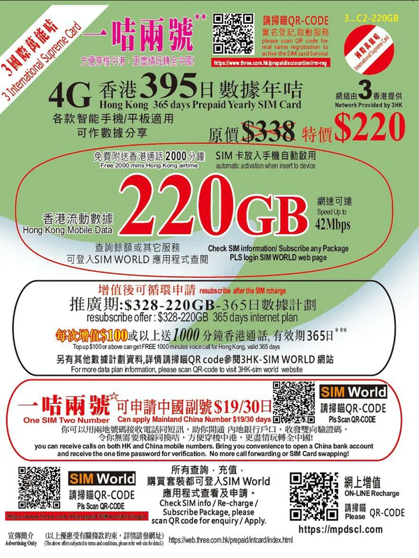 - 可增值使用,增值後可以優惠價$328循環申請同一計劃(220GB,有效期365日)