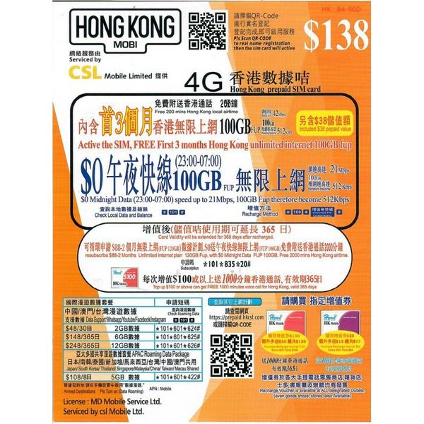 HK MOBI【100GB / 90日】【香港】4G/3G 無限數據卡上網卡SIM卡電話卡本地儲值月咭