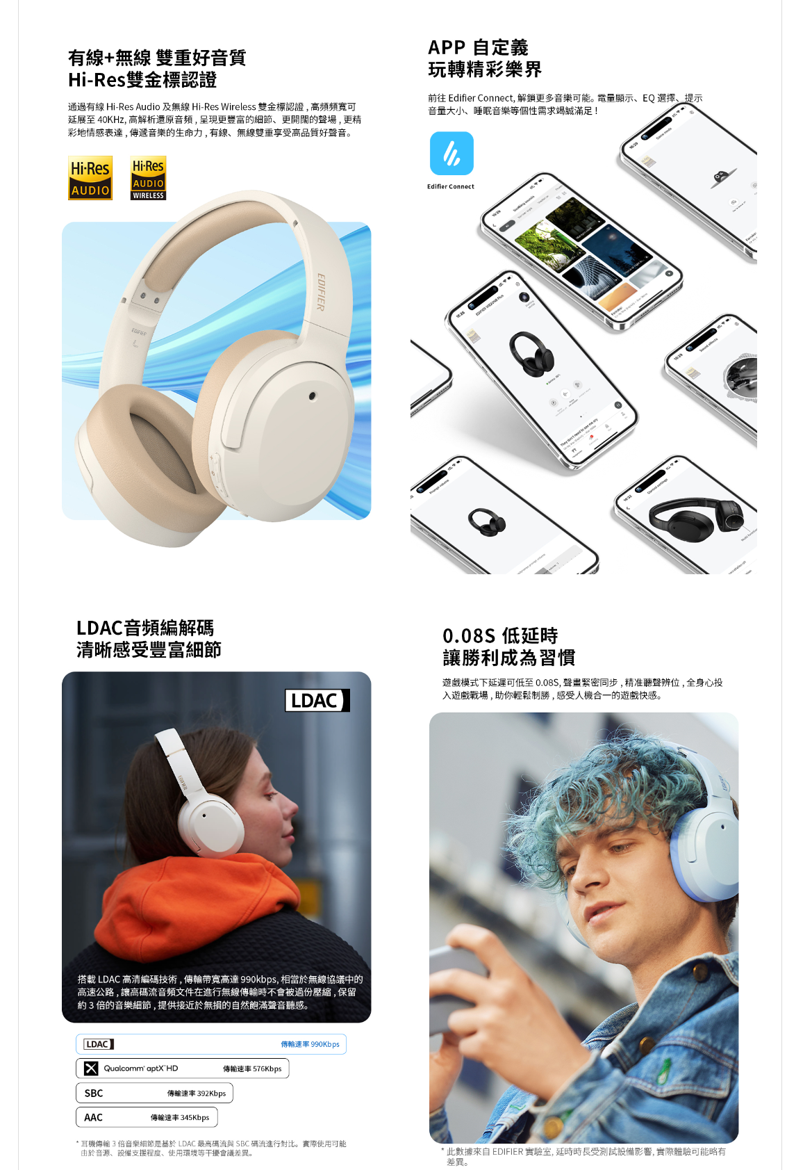 漫步者 W820NB Plus 黑色 雙金標 HI-Res 40mm LDAC 主動降噪 通話降噪 藍芽 頭戴式無線耳機 0.08S 低延時 Type C 充電