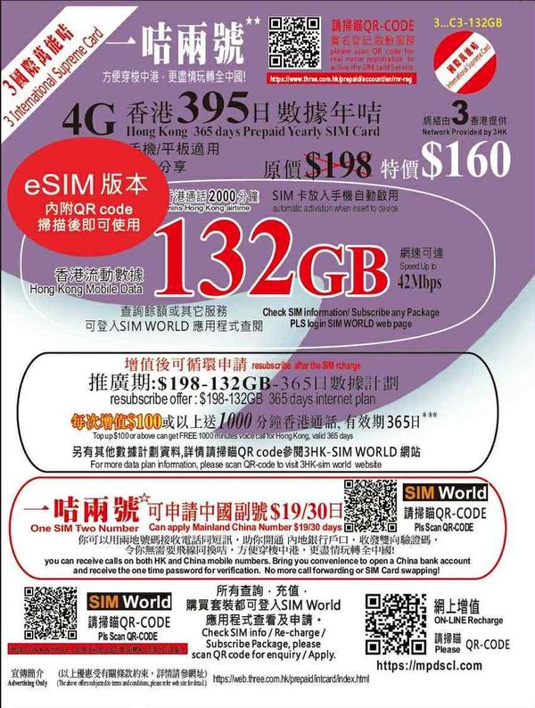 (E-SIM) 3HK「3萬能卡」香港本地132GB版E-SIM。