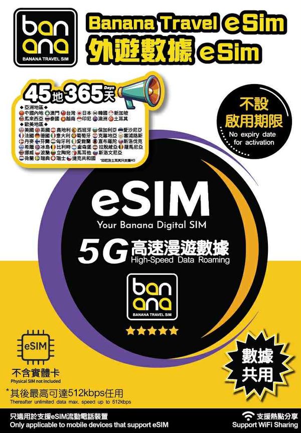 E-SIM BANANA 52地 365天 5G 10GB/20GB 高速漫遊無限數據年卡