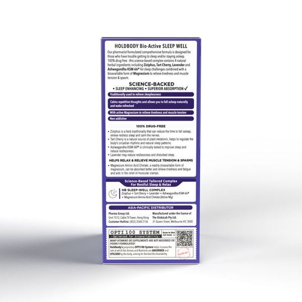 由藥劑師研發的 Holdbody Bio-Active 活性舒壓睡眠配方 透過獨有 ⌜OPTI-BA System 高效營養優化系統⌟ 提供高效天然植物萃取助眠配方,特別適合有壓力、緊張情緒及睡眠質素欠佳人士服用; 有效平静反覆不安思想情绪,讓你放下憂慮,鬆馳地享受一個高質素深層的自然睡眠。