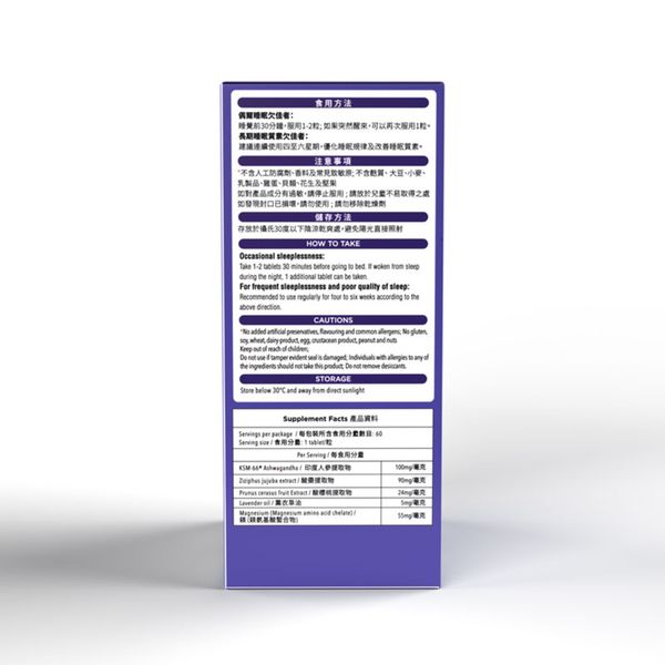 HB 天然深睡抗疲勞配方(印度人蔘 KSM-66® 提取物、酸棗提取物、酸櫻桃提取物、 薰衣草油、 鎂 (鎂氨基酸螯合物))
