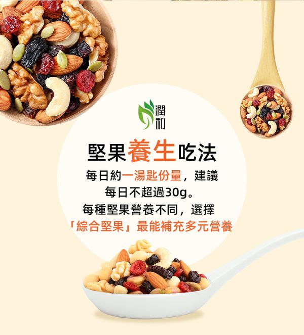 每日約一湯匙份量,建議每日不超過30g.每種堅果營養不同,選择综合堅果」最能補充多元營養