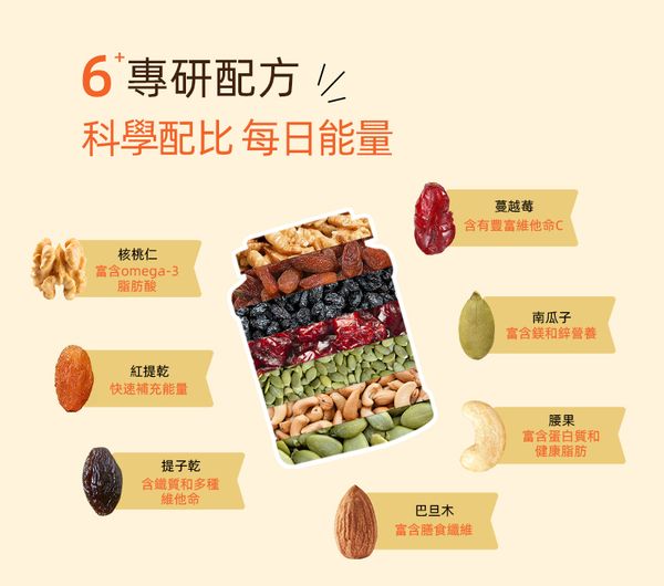 【成 份】 核桃仁,紅提乾,提子乾,蔓越莓乾(蔓越莓糖 食用油),南瓜子,腰果仁,巴旦木仁
