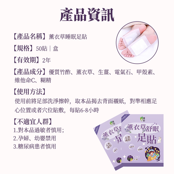 潤和薰衣草舒眠足貼 使用優質竹酢成分,添加薰衣草精華、生薑、艾草、維他命C等成分,植物配方,結合中醫經絡理論,促進新陳代謝,排出廢物,提高睡眠質素。