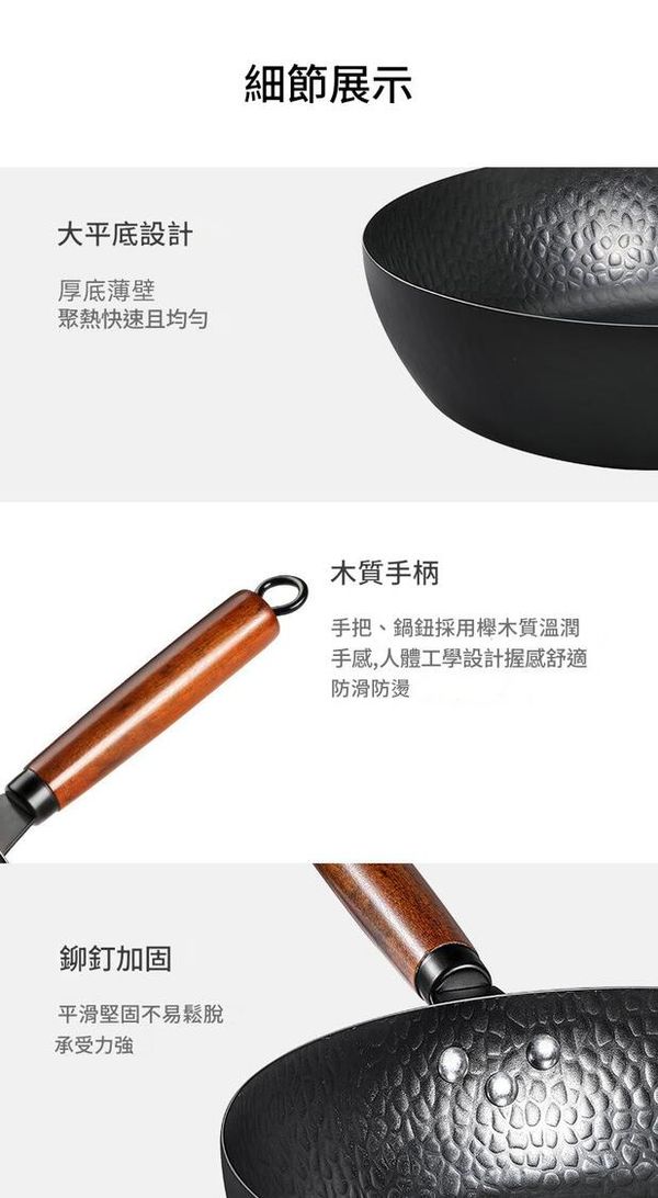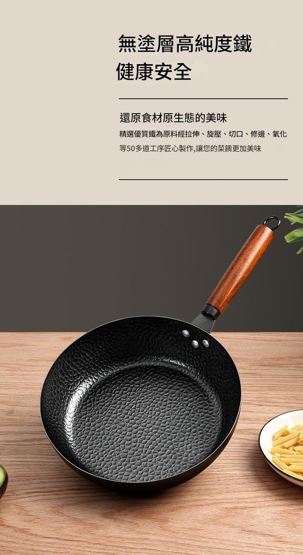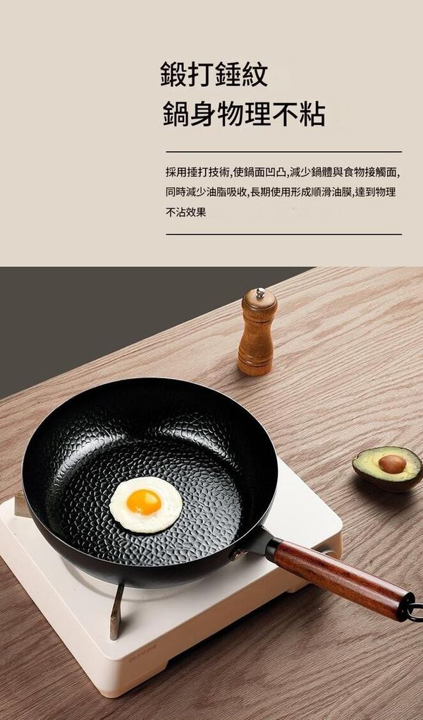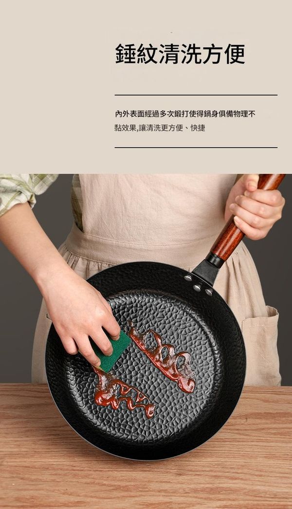 鍋身採用鍛打錘紋設計,減少食物接觸面,油脂吸收少,長期使用形成天然油膜,輕鬆實現物理不黏效果。