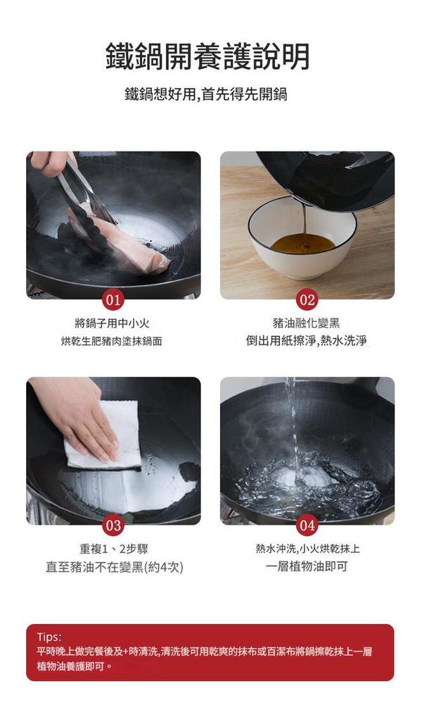 :中火預熱後使用效果更佳,避免空燒或烹煮酸性食物,使用後擦乾抹油即可防鏽。