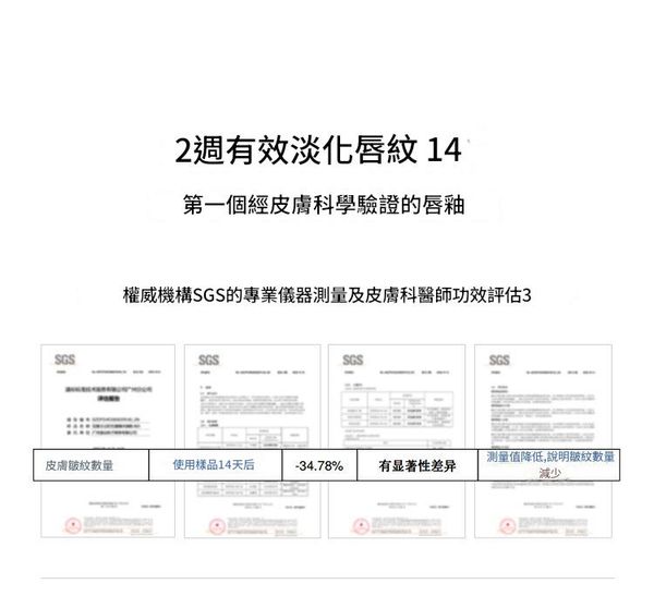 使用2週後,唇部皺紋數量減少34.78%,真正實現妝護合一,就像為嘴唇敷上精華+唇膜!