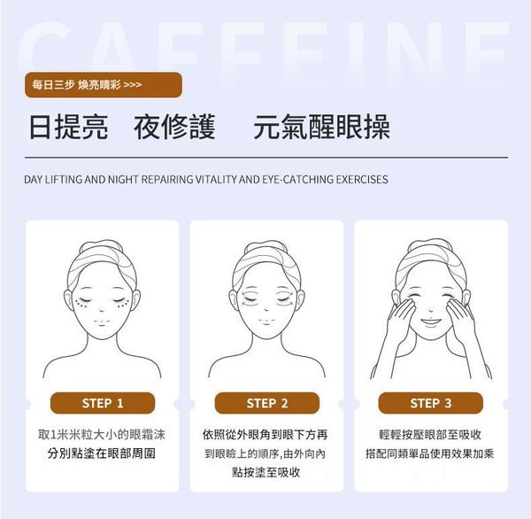 每日早晚於眼周輕點按摩,搭配輕壓促進吸收,日夜修護煥亮眼周肌膚。