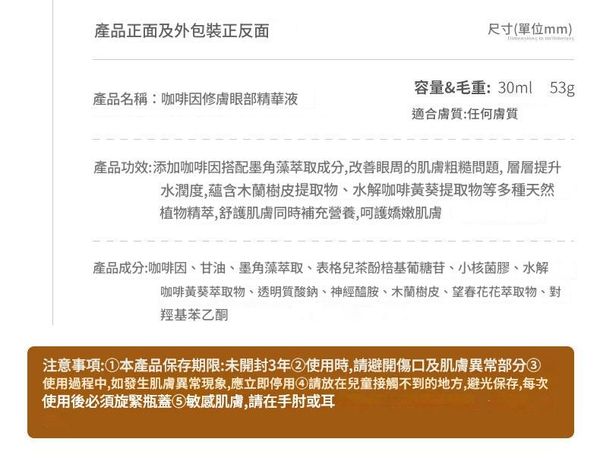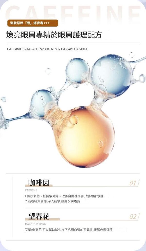 蘊含高濃度咖啡因活性成分,結合多種天然植萃,溫和修護、深度滋養,輕鬆告別浮腫、黑眼圈與細紋問題,重現年輕亮澤的雙眸!