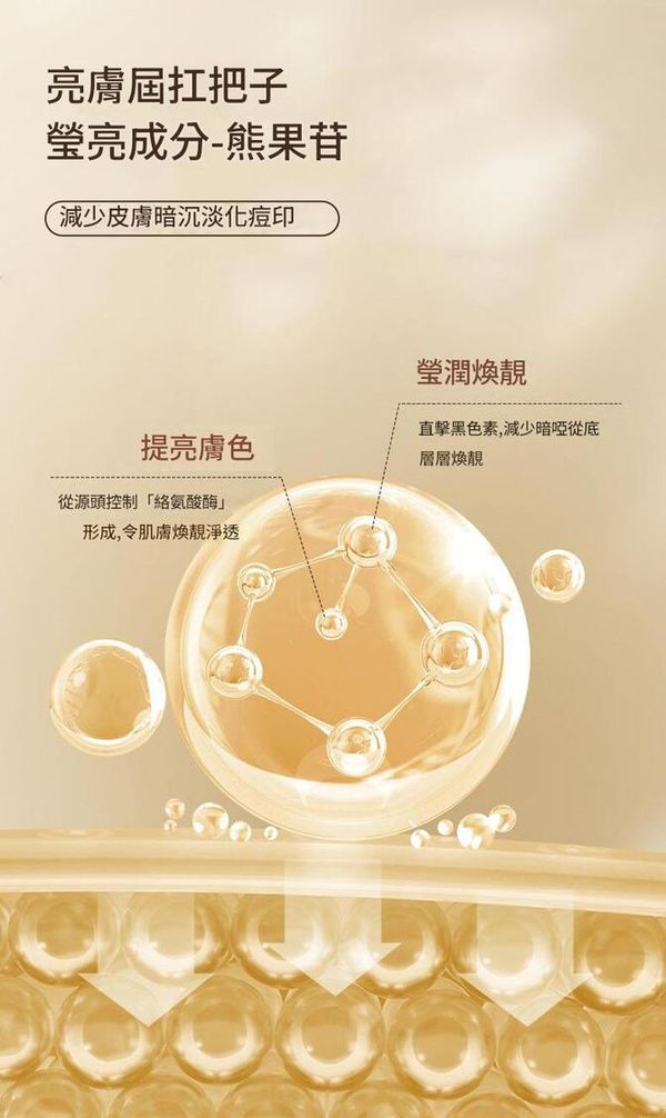 添加α-熊果苷,從源頭抑制黑色素,減少暗沉、淡化痘印,讓肌膚勻淨透亮。