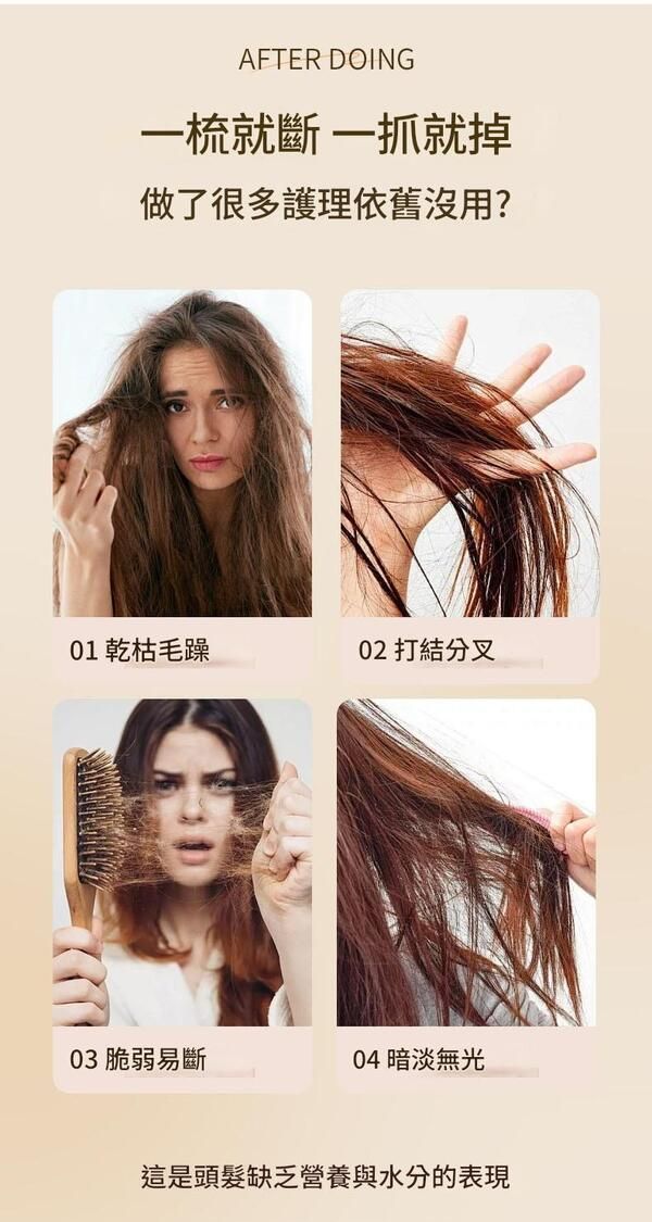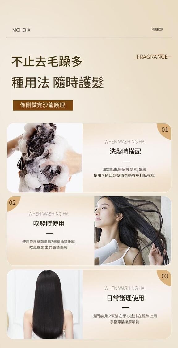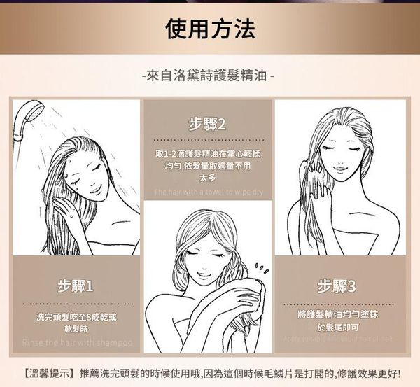 取1-2滴於掌心,均勻塗抹於髮尾,建議於頭髮八成乾時使用,修護效果更佳。