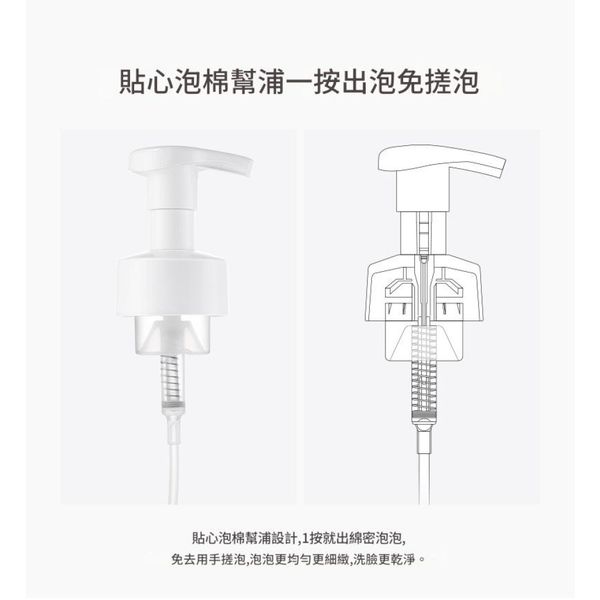 一按出泡泵頭:免搓泡,按壓即產生均勻細膩泡沫,方便又衛生。