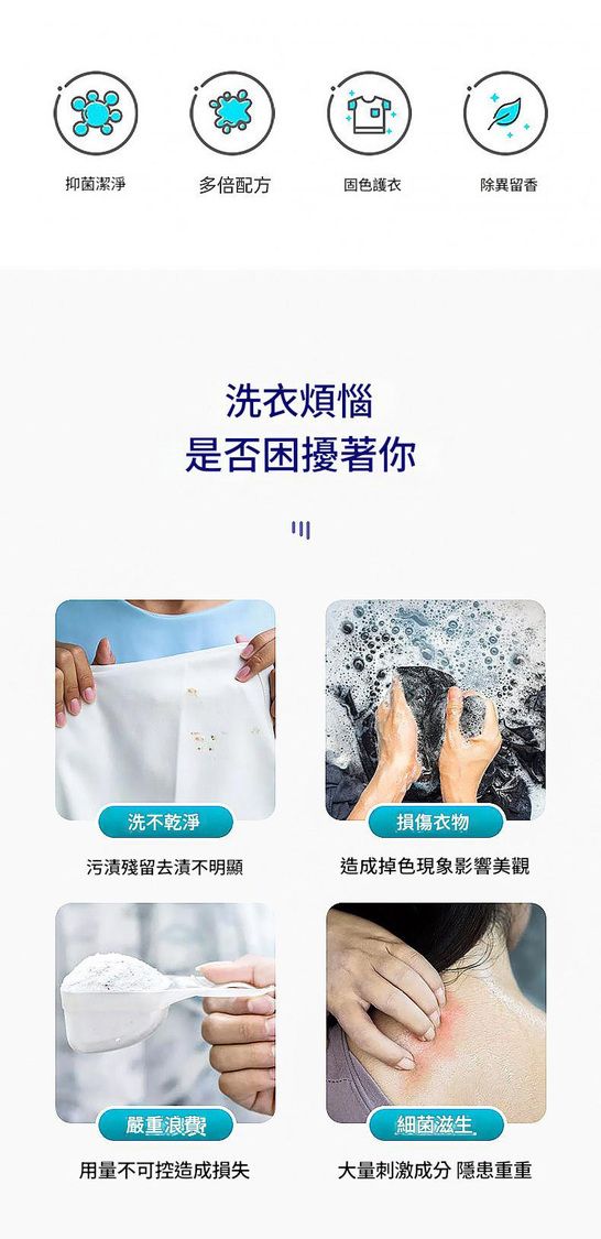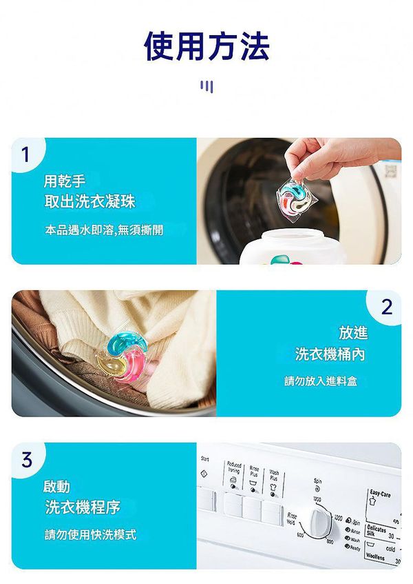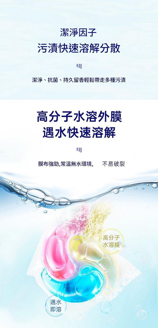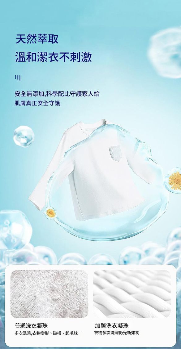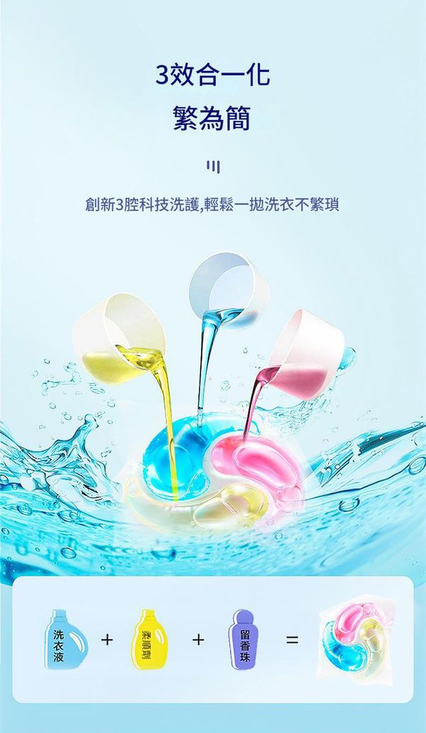 - 3效合一科技:洗衣液 + 柔順劑 + 留香珠,深層去污、抗菌護色、持久留香,洗衣從此化繁為簡。