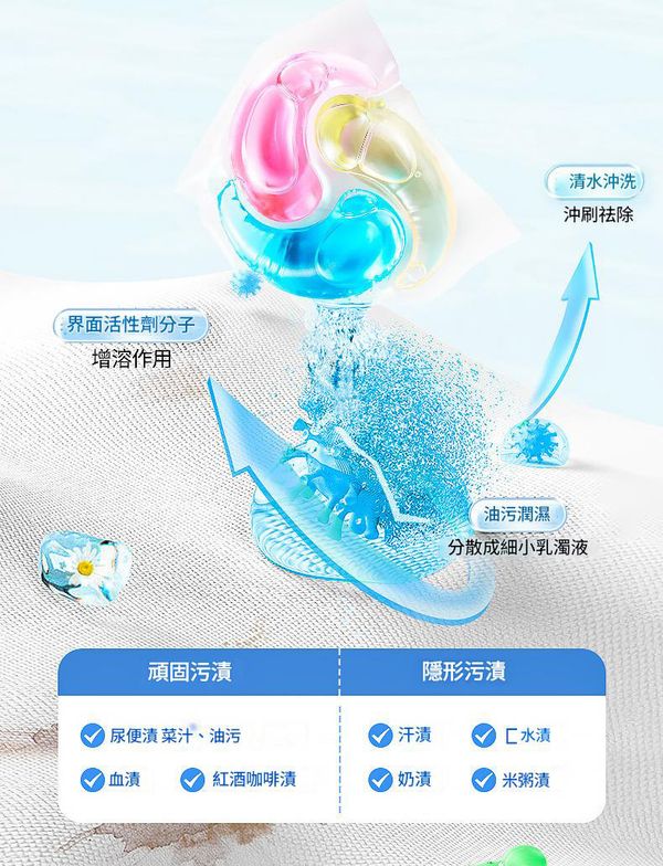 - 強效去漬:針對頑固污漬(血漬、油污、咖啡漬等)和隱形污漬(汗漬、口水漬),快速溶解不殘留。