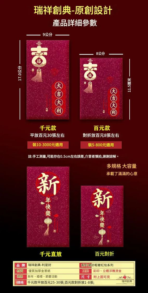 瑞祥創典原創設計「磨砂輕奢紅包袋」,選用優質金蔥磨砂紙材,結合立體浮雕燙金工藝,手感高級、視覺璀璨。無論是千元大鈔平放,還是百元鈔對折收納,都能完美承載您滿滿的心意與祝福!