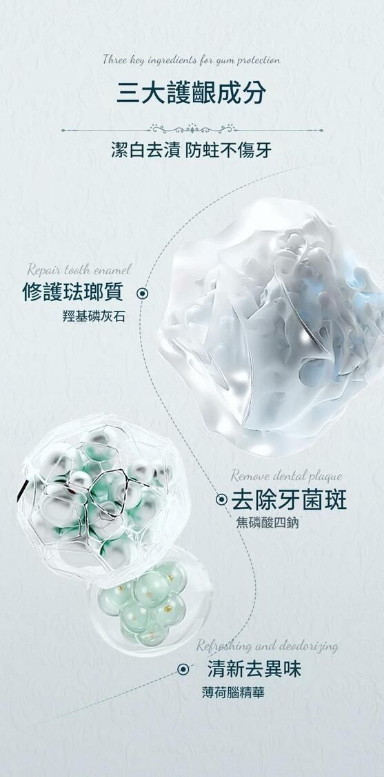✅ 溫和護齦不刺激:添加羥基磷灰石、焦磷酸四鈉、薄荷腦精華,修護琺瑯質、去除牙菌斑、清新口氣,溫和配方適合敏感牙齦。
