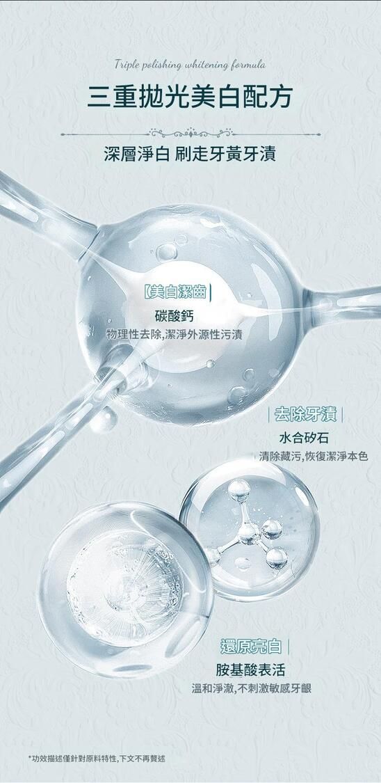成分功效碳酸鈣物理性溫和摩擦,有效去除外源性污漬水合矽石細緻潔淨牙面,清除藏污,還原牙齒本色胺基酸表活溫和淨澈,不刺激牙齦,適合日常使用