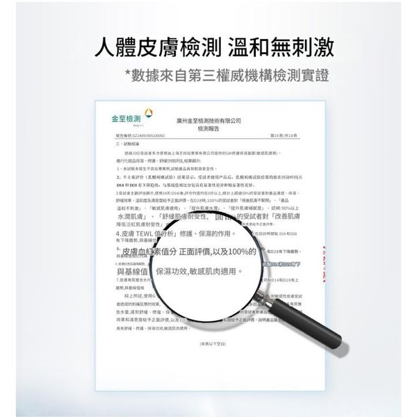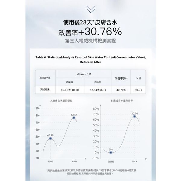 第三方機構(金至檢測)33位受試者(34-58歲)4週實測,皮膚含水量提升30.76%(p值<0.01)。