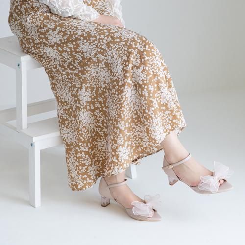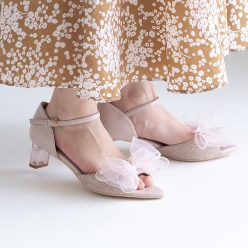 尖頭鞋頭×細小的透明鞋跟,做成了不會太甜美的優雅造型。