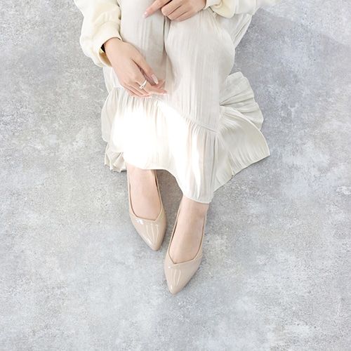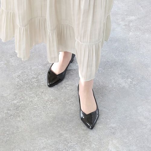 鞋頭採用光澤琺瑯材質,給人一種優雅的印象。 俐落的尖頭,即使是低跟鞋,也能讓你的雙腿看起來很漂亮,粗低跟鞋也推薦日常使用。 內部材料採用聚氨酯材料,對腳部溫和。