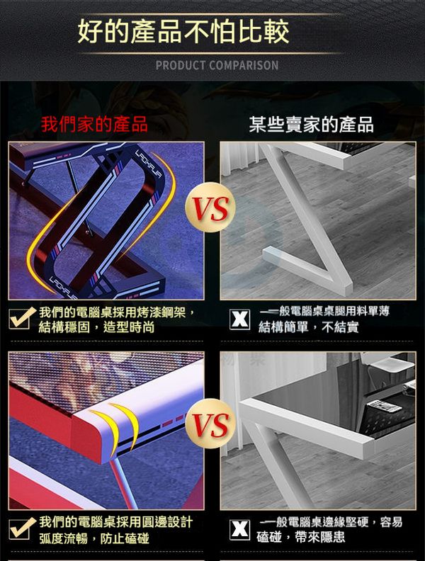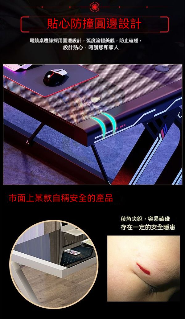 貼心防撞圓邊設計:電競桌邊缘探用回邊設計,弧度流美觀,防止磕碰設計贴心,呵護您和家人