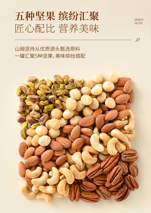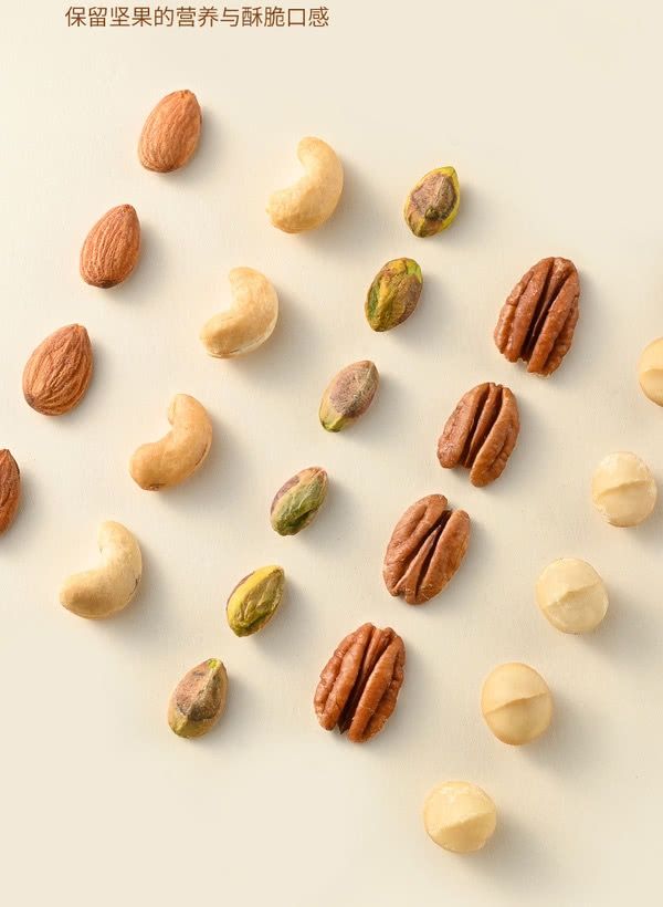 配料:腰果仁,扁桃仁,碧根果仁,夏威夷果仁,开心果仁(实际以包装信息为准)