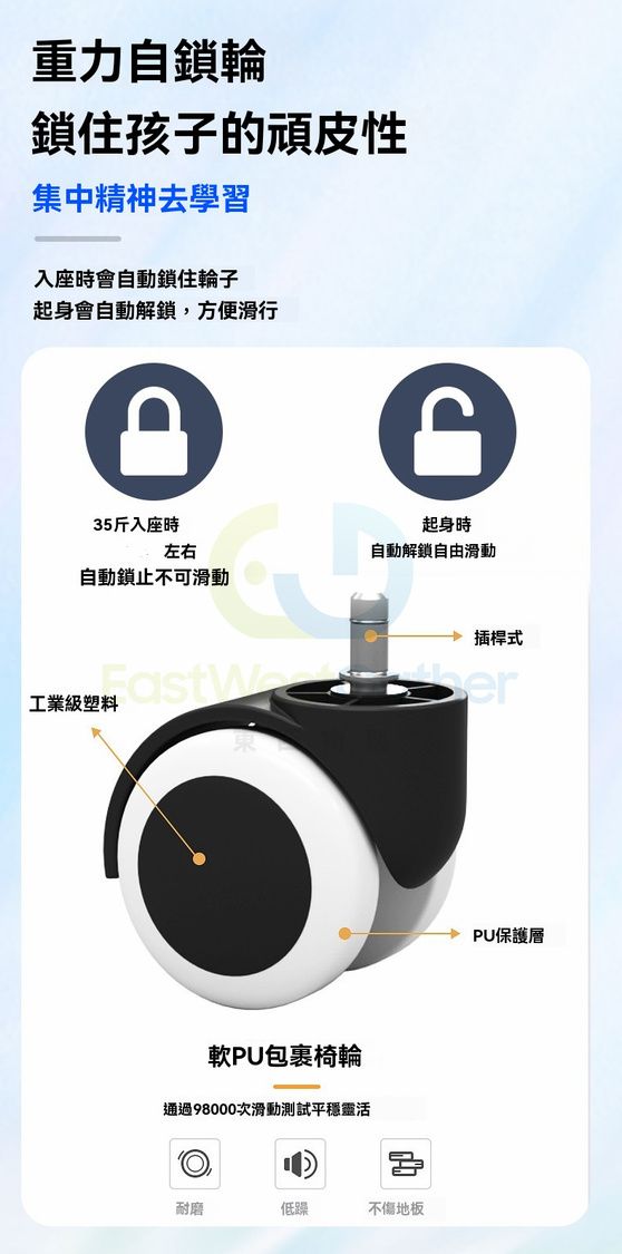 重力自鎖輪鎖住孩子的頑皮性:入座時會自動鎖住輪子起身會自動解鎖,方便滑行