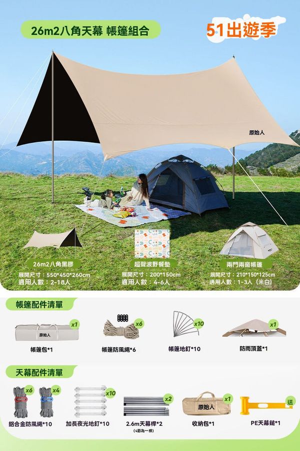 包送貨-[小帳篷+天幕]26㎡八角奶咖+帳篷+野餐墊-露營帳篷 速開帳篷 沙灘帳篷 C22228-12