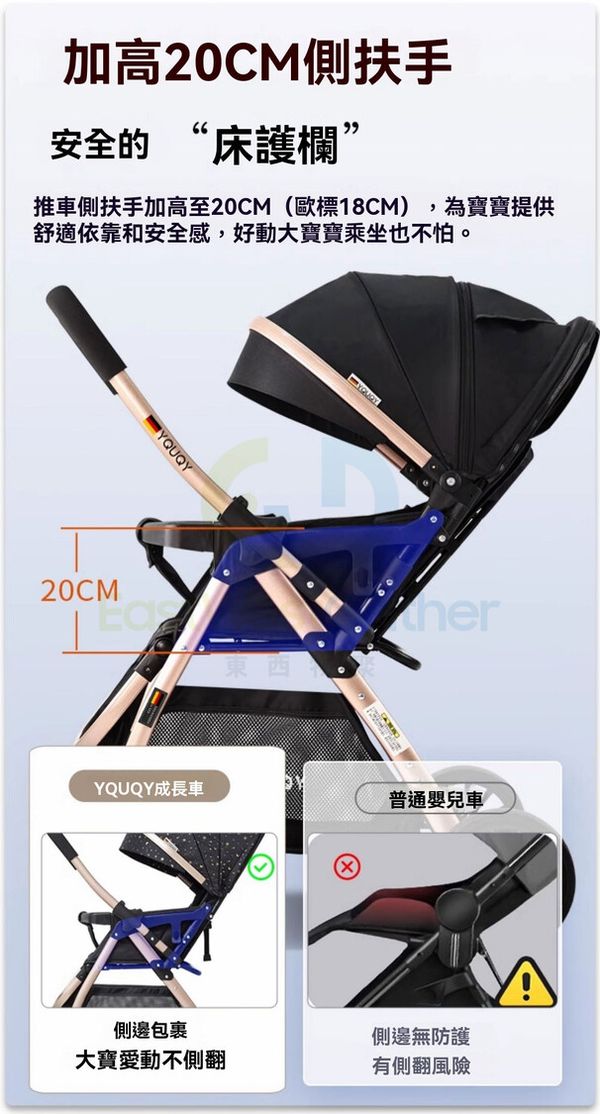 推車側扶手加高至20CM(歐標18CM),為寶寶提供舒適依靠和安全感,好動大實寶乘坐也不怕。