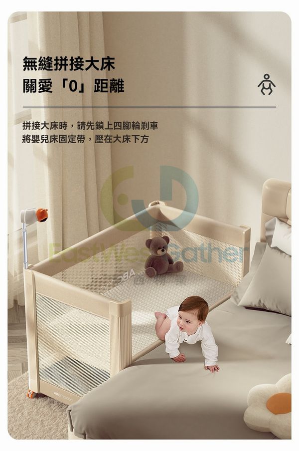 拼接大床時,請先鎖上四腳輪刹車將嬰兒床固定帶,壓在大床下方
