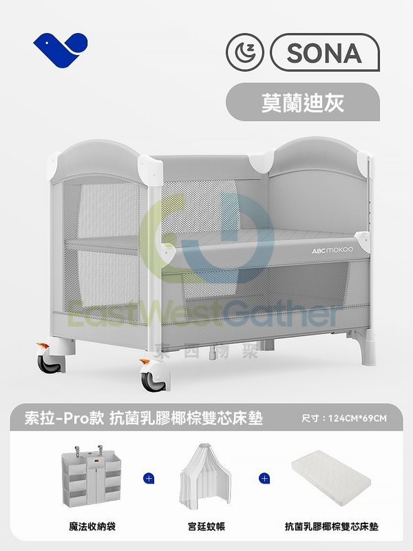 包安装送貨-莫蘭迪灰+魔法收納袋+宮廷蚊帳+抗菌乳膠椰棕雙芯床墊-實木新生嬰兒床 寶寶床 兒童床 BB床