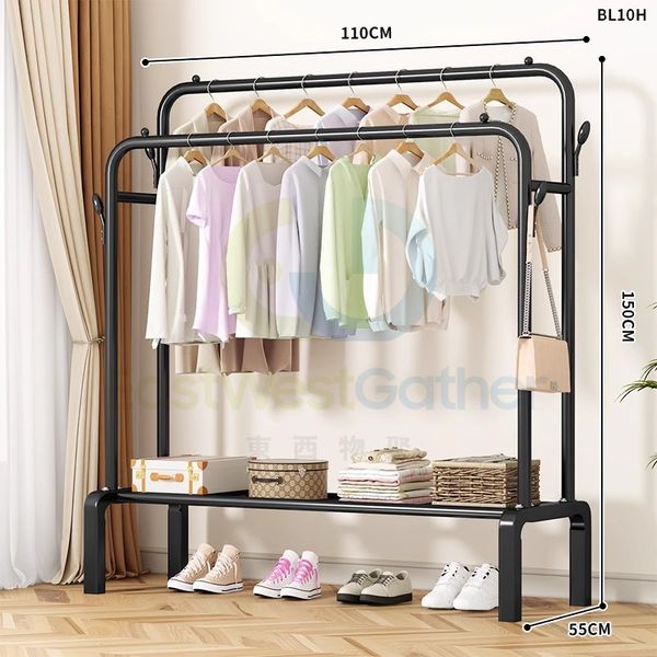 包安裝送貨-碳鋼款|長1.1米【黑雙杆】4衣帽鉤-落地晾衣架 衣帽架 臥室晾衣架