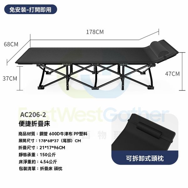 包送貨免安裝 - 摺疊床 Folding bed 68*178cm黑送護頸頭枕 摺床 工人床 午休折疊床 簡易陪護便攜辦公室午睡神器(M22660-06)