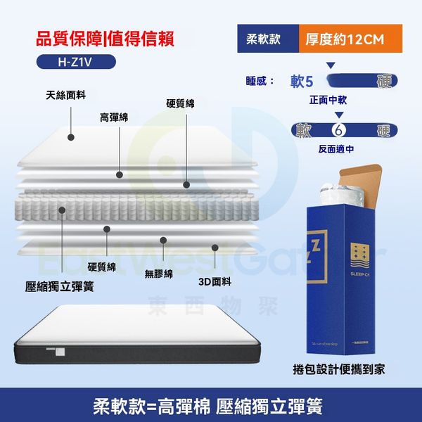 包送貨-柔軟款(厚度約12CM)獨立彈簧+高彈棉 150cm*200cm-記憶棉床褥 護脊獨立彈簧床墊 彈弓壓縮乳膠軟墊 高回彈 Memory Cotton Mattress(N22097-08)