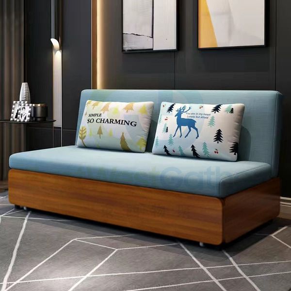 包送貨-梳化床 日式折疊沙發床 Foldling sofa bed 椰棕版(帶抽屜或儲物)淺藍色/胡桃色底框 1.5米 收納儲物兩用梳化 小戶型單人雙人床 布藝(N22128-311)