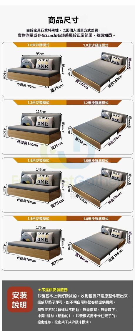 梳化床安裝好才發貨的,收到開箱原整件取出來,插穩靠背、擺放好墊子即可。