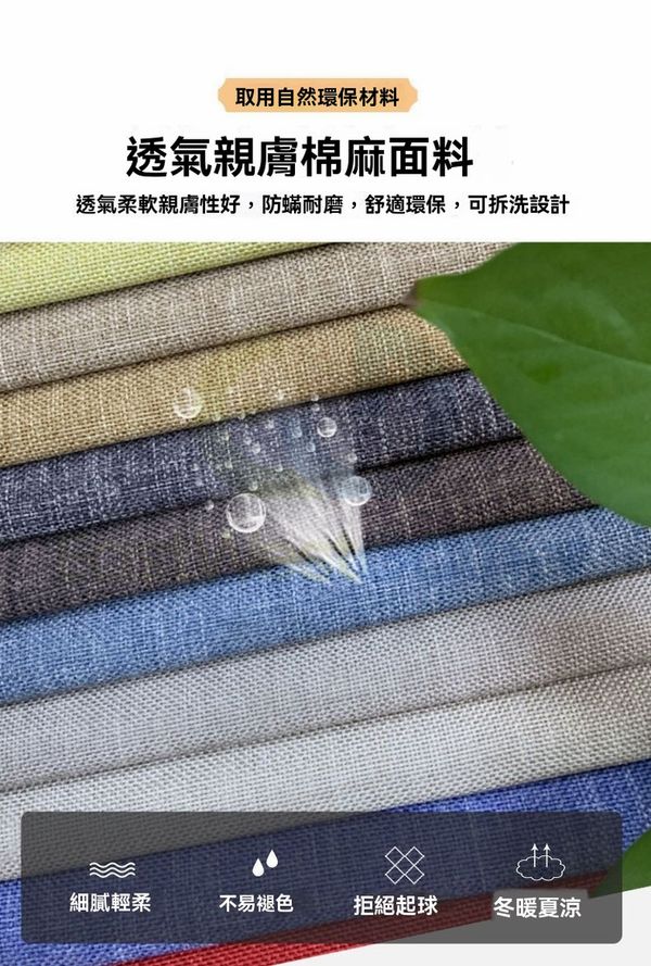 取用自然環保材質,透氣棉麻布料,柔軟親膚性好,防蟎耐磨,舒適環保,可拆洗設計